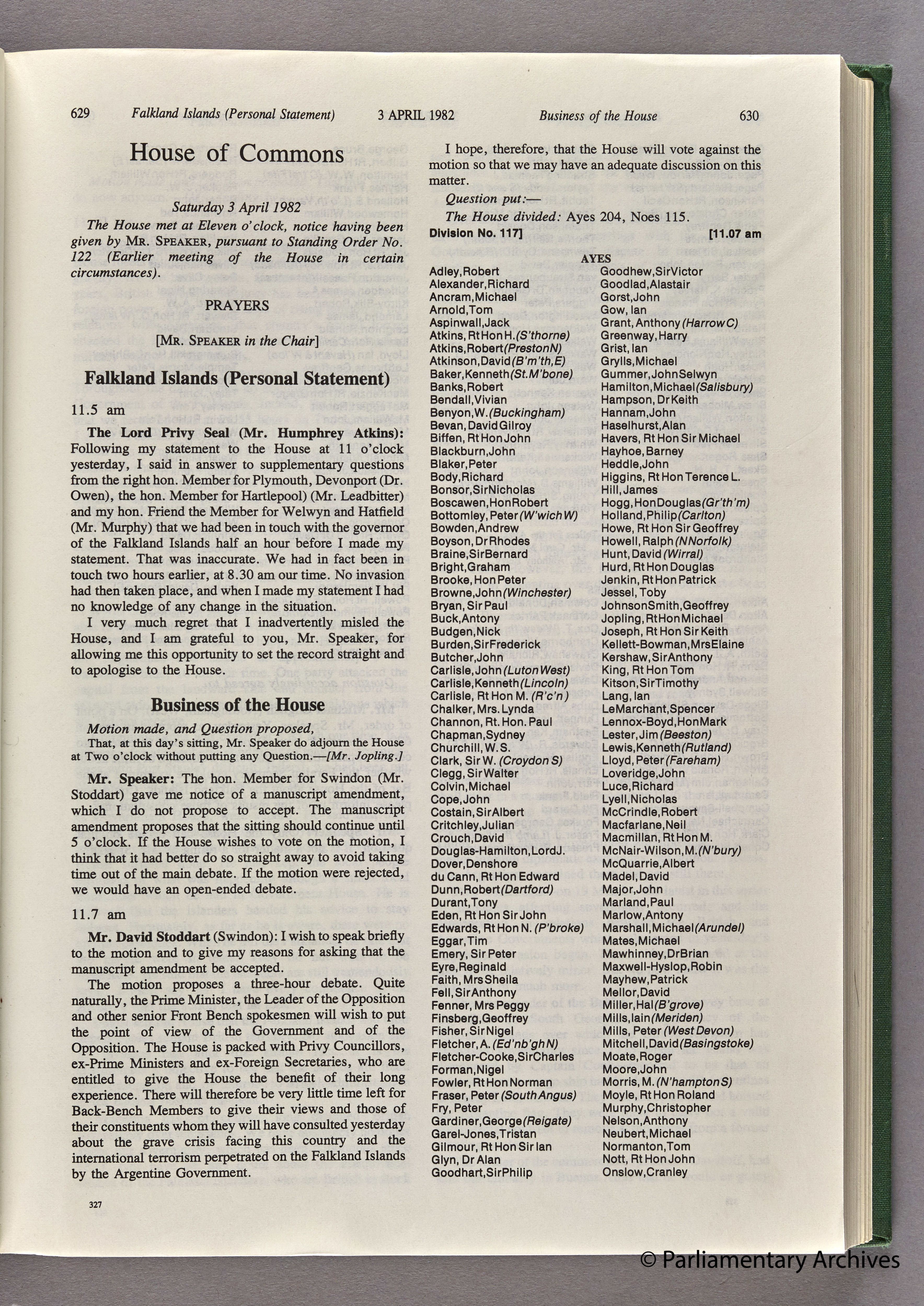 The session was called to debate what Britain’s next steps should be following the landing of Argentinian forces on East Falkland.